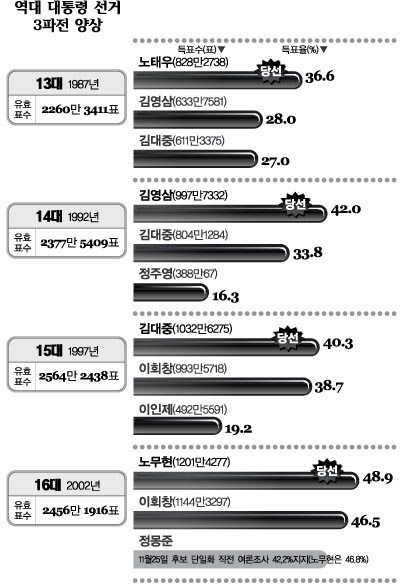 대선정국이 ‘3파전’으로 전 개될 것이라는 전망이 최근 들어 정가에 화제로 부상하고 있다. 지금까지 올해 대선은 한나라당 후보와 범여권 후보의 양자 대결이 될 것이라는 관측이 우세했다. 하지만 역대 대선이 3파전으로 전개됐 다는 사실을 감안해 최근 들어 3자대결 시나리오가 최종 실현여부를 떠나 그럴싸하게