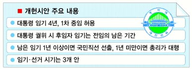 시안에는 대통령 궐위 때 후임자 임기는 전임 대통령의 잔여 임기로 하며, 남은 임기가 1년 이상이면 국민 직선으로 후임자를 뽑고,1년 미만이면 총리가 대통령 권한을 대행토록 하는 내용을 포함하고 있다.