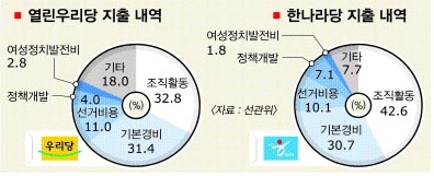 이밖에 ‘기본경비’가 31.0%인 472억 7400만원,‘기타지출’이 12.3%인 187억 8900만원의 지출 규모를 보였다. 선거용 지출이 늘면서 ‘여성정치발전비’도 전년의 4.7%에서 2.2%로 줄었다.