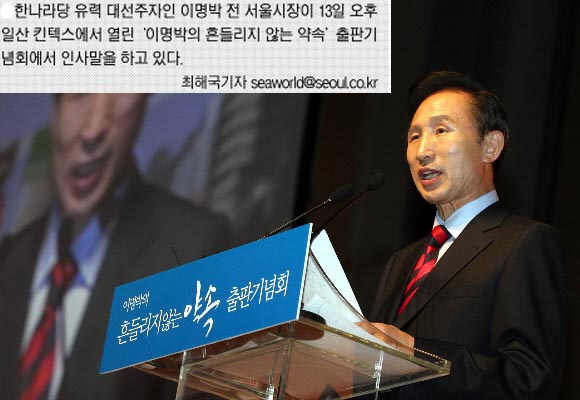 이 전 시장은 13일 경기도 일산 킨텍스(KINTEX)에서 ‘온몸으로 부딪쳐라’,‘흔들리지 않는 약속’,‘어머니’ 등 자신의 저서 3권의 출판기념회를 개최, 본격적인 세몰이에 나선 형국이다. 이 자리엔 김영삼 전 대통령을 비롯해 강재섭 한나라당 대표, 김진홍 뉴라이트전국연합 상임의장, 이용규 한국기독교총연합회장 등 정치원로·종교계·학계·체육계 등에서 국내외 인사 2만여명이 참석, 성황을 이뤘다.