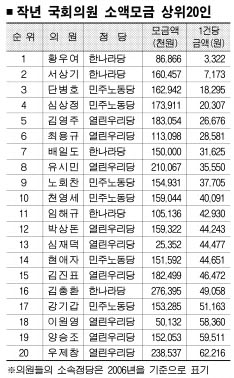 반면 한나라당 의원들의 후원금은 58억원이 증가, 전년 대비 40.1%의 높은 신장률을 보였다.