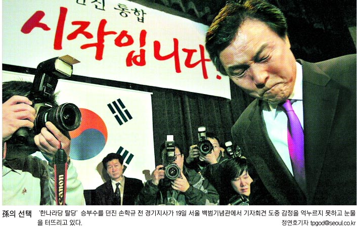 손학규 전 경기지사가 19일 서울 효창동 백범기념관에서 한나라당 탈당을 선언하고 새로운 정치 질서를 창조하겠다고 밝혔다. 손 전 지사는 이날 기자회견에서 “낡은 수구와 무능한 좌파의 질곡을 깨고 새로운 대한민국을 위한 새 길을 창조하기 위해 한나라당을 떠나기로 했다.”고 말했다.