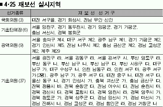 한편 국회의원 선거가 치러지는 세 곳은 열린우리당 구논회 의원이 사망한 ‘대전 서구을’과 열린우리당 안병엽 의원이 선거자금으로 5000만원을 받은 혐의가 확정된 ‘경기 화성시’, 대선후보와 당대표 경선과정에서 각각 4억원,6억원을 수수한 혐의가 확정된 민주당 한화갑 의원의 ‘전남 무안·신안’ 지역이다.
