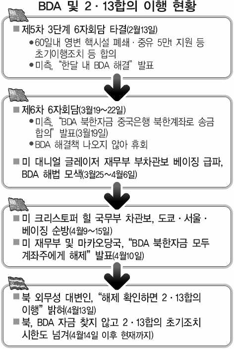 북한의 영변 핵시설 폐쇄 및 중유 5만t 지원 등 6자회담 ‘2·13합의’ 초기조치가 방코델타아시아(BDA)문제에 막혀 이행 시한인 14일을 넘기면서 당사국들 사이에서 6자회담의 동력 상실에 대한 우려의 목소리가 나오고 있다. 한국과 미국 등은 “아직까지 인내의 한계를 넘을 정도는 아니다.”며 어그러진 2·13합의 이행 과정을 추스리는 분위기가 역력하다.