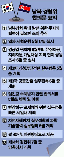 남북은 또 열차 시험운행을 조건으로 발효되는 ‘경공업·지하자원 협력사업’을 6월 중 착수하기로 합의, 경공업 원자재를 6월부터 북한에 제공하고 같은 달 북한 지하자원 개발을 위한 대상지역 현지공동조사도 실시키로 했다.