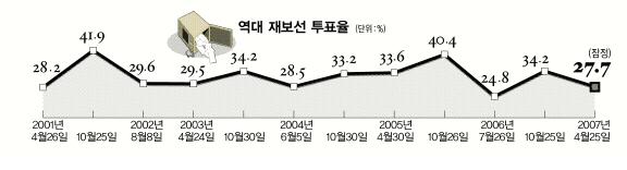 이는 전체 유권자 274만 201명 중 76만 240명이 투표한 것이다. 직전 선거인 지난해 10·25재보선 투표율 34.2%보다 6.5%포인트 낮은 수치다.
