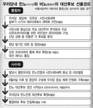 반면 비노그룹은 제3지대 통합신당 건설에 방점을 찍었다. 의견그룹별로 차이는 있다. 당 지도부와 중진의원,‘처음처럼’ 등 초선의원들은 ‘선 통합·후 당 해체’를 주장한다. 정동영·김근태 전 의장과 일부 수도권·호남·충청지역 의원들은 ‘선 당 해체·후 통합’에 가깝다. 우선 우리당과 민주당, 탈당파, 시민사회세력이 제3지대에서 세력화를 선언하고 주요 대선주자가 동참선언을 하면 자연스럽게 후보자 연석회의가 이루어진다는 구상이다. 시민사회세력이 국민경선관리위원회를 만들어 오픈프라이머리를 위한 규칙을 세우면 6월 말쯤 창당 절차를 밟는다는 복안이다.