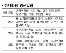 경선규칙이 확정된 가운데 한나라당은 23일 당 선관위를 발족하고 28일 후보검증위를 발족시키며 경선일정을 차질없이 진행시킨다는 계획이다. 당 선관위가 출범하면 이 전 시장과 박 전 대표는 이달 말이나 다음달 초에 예비후보로 등록한다고 밝혔다.