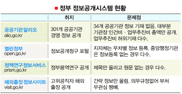 열린정부시스템의 경우 등록된 정보목록이 5600여만건에 달했지만 실적 위주로 정보를 마구잡이식으로 올려놓아 오히려 국민들을 헷갈리게 하고 있다. 차관급 이상 해외출장 정보를 올려놓은 해외출장정보시스템에는 출장을 가서 누구를 어떤 목적으로 만났는지에 대한 설명조차 없고, 상당수는 기록을 누락시켰다.301개 공공기관의 경영정보를 볼 수 있는 알리오시스템의 경우 34개 기관은 2년간 정보를 아예 올리지 않았다. 기관장 업무추진비 등 민감한 사안은 총액만 공개하거나 허위로 입력했다. 정책연구정보서비스도 등록을 하지 않거나 용역보고서 원문은 없이 제목만 덜렁 올려놓은 부처들이 많았다.