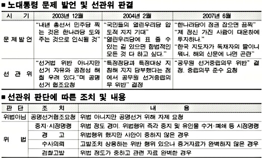 오전 10시 고 선관위원장이 “선관위 전체회의를 개의합니다.”라고 의사봉을 두드리며 노 대통령의 참평포럼 연설내용에 대한 위법성 여부 심사가 시작됐다. 선관위원석에는 선거·정당·정치자금 법규집과 대법전, 선거관리위원회 법규집, 국민투표법령집 등 4권의 책자가 놓였다.