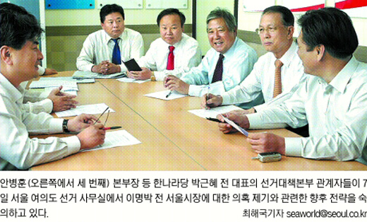 이 전 시장측은 검증공방 전략도 바꾸는 분위기다. 캠프 관계자는 “박 전 대표 진영의 곽성문, 최경환 의원을 검찰과 중앙선거관리위원회에 허위사실유포 등의 이유로 고발하는 방안을 검토키로 했다.”고 했다.