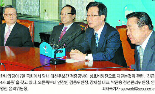 한나라당 유력 대선주자인 이명박 전 서울시장과 박근혜 전 대표 진영의 검증 공방이 전면전으로 치닫고 있다. 이 전 시장측에서는 박 전 대표측의 곽성문·최경환 의원을 상대로 검찰 고발 방안도 검토하고 있다.