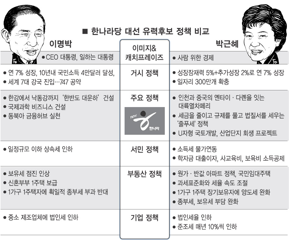 박 전 대표가 대통령의 딸이라는 자신의 정치적 유산이자 부담인 점을 장점으로 활용하려고 접근한 반면 이 전 시장의 선언문에는 이렇다 할 인간적인 풍모나 체취를 담지 않았다.