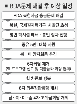 BDA 송금이 이뤄짐에 따라 초기조치 등 비핵화 이행이 급물살을 타고 차기 6자회담도 이르면 이달말 열릴 것으로 보인다.