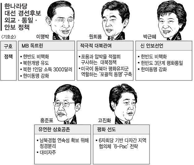 6·15 7돌을 하루 앞둔 14일 한나라당 대선 경선후보들이 잇따라 통일·외교·안보 분야 정책을 발표했다. 이 분야 토론회는 오는 19일 대전에서 열린다. 외교·안보 분야 정책에서는 이명박·박근혜 후보가 원희룡·홍준표·고진화 후보에 비해 약간 더 보수적 입장을 취했다. 이 후보와 박 후보는 둘 다 한·미동맹 강화를 정책기조로 삼았다. 두 후보는 또 차기정부에서 전시작통권 환수 시기 등에 대해 재협상을 펴야 한다고 한목소리를 낸다.
