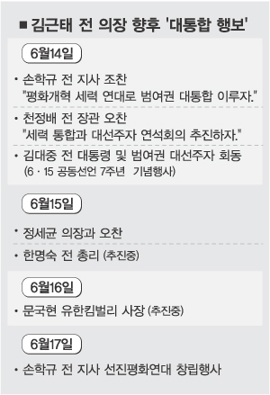 김근태 전 열린우리당 의장과 범여권 통합을 위해 노력하기로 약속한 손학규 전 경기도지사의 행보에 관심이 쏠리고 있다. 특히 김 전 의장이 국면경선 참여를 요청한 상황에서 손 전 지사가 어떤 선택을 할지 주목된다. 손 전 지사는 그동안 범여권과 거리를 유지하며 독자세력화에 무게를 두고 움직여왔다. 하지만 14일 회동에서는 달라진 기류가 느껴진다. 전날 “대통합·대단결은 반드시 필요하다.”며 ‘대통합’이라는 말을 처음 사용한 것과 맥을 함께 한다.