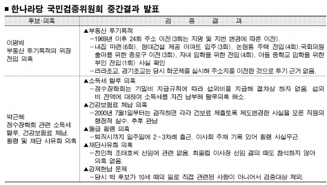 한나라당 국민검증위원회 이주호 간사는 22일 국회에서 기자회견을 갖고, 검증위에 제보된 120여건의 검증 요구 가운데 조사를 마친 사안들에 대해 이같은 결론을 내렸다고 밝혔다.