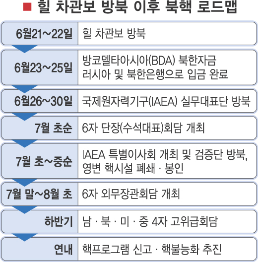 이와 관련, 북한 외무성 대변인은 이날 힐 차관보 방북시 금융거래 협력 강화 및 2·13합의 이행을 위한 행동조치 등 ‘포괄적이고 생산적인 협의’가 있었다고 전한 뒤 “7월 상순 6자 단장(수석대표)회담을 열고,8월초 필리핀 아세아지역안보포럼(ARF)장관회의 기간에 6자 외무상회의를 개최하기 위한 가능성을 검토하고 그것을 성사시키기 위해 협력키로 했다.”고 밝혔다. 비핵화 조기 진전을 위한 한·미간 발걸음도 빨라지고 있다. 송민순 외교통상부 장관은 오는 27일 미국을 방문, 현지시간 28일 콘돌리자 라이스 국무장관과 회담을 갖고 초기단계 이후 북핵시설 불능화와 핵프로그램 전면 신고로 이행하는 방안을 협의한다.