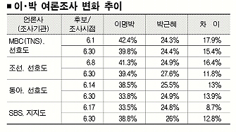 반면 동아일보와 코리아리서치센터가 같은날 실시한 여론조사의 경우, 두 후보간 지지율 차이는 2주전에 비해 약간 벌어졌다. 이 후보 33.8%, 박 후보 24.9%의 지지율로 13.9%P 차이가 났다. 지난달 14일 조사에서는 이 후보 38.5%, 박 후보 25.%로 13%P 차이였다.