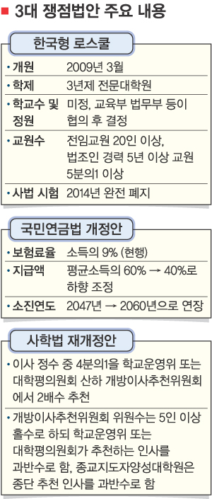 사립학교법 재개정안과 로스쿨법안이 3일 자정 무렵 폐회된 임시국회 본회의에서 임채정 국회의장의 직권상정으로 극적 통과됐다. 앞서 한나라당과 열린우리당, 통합민주당은 국민연금법도 통과시켜 3대 쟁점법안이 모두 처리됐다. 사학법 재개정안은 개방형 이사 추천 위원회 구성 비율을 ‘학교운영위 또는 대학평의회’와 ‘이사회’를 6대5로 정했다.