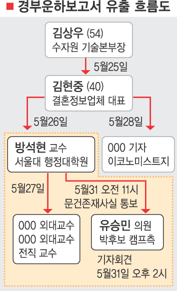 경찰조사 결과 결혼정보업체 대표 김현중(40)씨는 지난 5월26일 수자원공사 김상우(54) 기술본부장에게서 입수한 보고서 복사본을 자신이 다니는 행정대학원 방석현(62) 교수에게 넘겼고, 방 교수는 박 전 대표 캠프의 유승민 의원에게 보고서 존재를 알린 것으로 확인됐다. 방 교수는 또 이 보고서를 같은 정책 연구모임의 교수 3명에게 건넨 것으로 밝혀졌다. 방 교수는 박 전 대표 캠프의 정책자문위원회 행정개혁특별위원장을 맡고 있다.