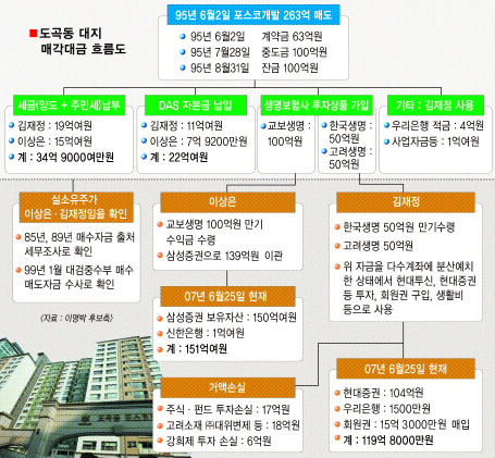 한나라당 이명박 대선 경선 후보의 차명보유 논란을 빚고 있는 ‘도곡동 땅’과 관련,이 후보측이 24일 매각자금 흐름도를 공개했다.