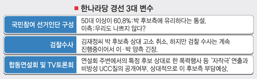 한나라당 대선 후보 경선 투표일이 다가오면서 이명박·박근혜 후보측이 경선 막판 변수에 촉각을 세우고 있다. 변수에 따라 ‘이명박 대세론’이나 ‘이명박 필패론’이 허망한 꿈이 될 수 있어서다.