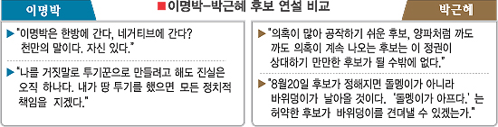 이 후보는 “진실이 살아 있는 한 나를 땅 투기꾼으로 몰지 못할 것”이라고 자신감을 내비치며 ‘필승론’을 이어갔다. 강원도에서 이 후보에 비해 상대적으로 높은 지지를 받는다고 평가받는 박 후보는 이 후보 필패론을 강조하는 한편으로 집권 비전을 조목조목 설명했다.