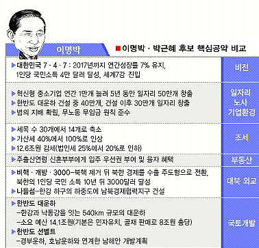 이명박 한나라당 대선경선 후보의 비전은 ‘7·4·7’ 경제성장론이고, 대부분 국토 개발에서 원동력을 찾고 있다. 이 후보 특유의 추진력을 바탕으로 한 개발주의 성향이 깔려 있다. 이런 비전을 실현하는 핵심 공약이 바로 ‘한반도 대운하’ 건설 계획이고, 최근에는 남해안 개발 계획인 ‘한반도 선벨트’ 공약도 내놨다.