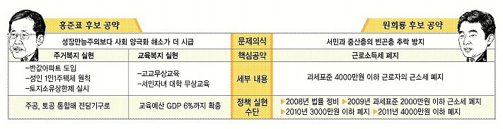 홍준표·원희룡 후보 모두 기존의 한나라당 기조보다는 약간 왼쪽으로 치우쳐 있다. 양극화·비정규직 문제 등 ‘빅 2’가 다루지 않은 주제를 비중있게 다뤘다.