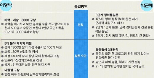 이명박·박근혜 후보의 대북 정책은 기본적으로 ‘북핵 폐기 뒤 지원’이라는 같은 형식을 취하고 있다. 하지만 이 후보는 ‘지원’에 초점을 맞추고 있고, 박 후보는 ‘북핵 폐기’에 방점을 찍고 있다는 점에서 다르다.