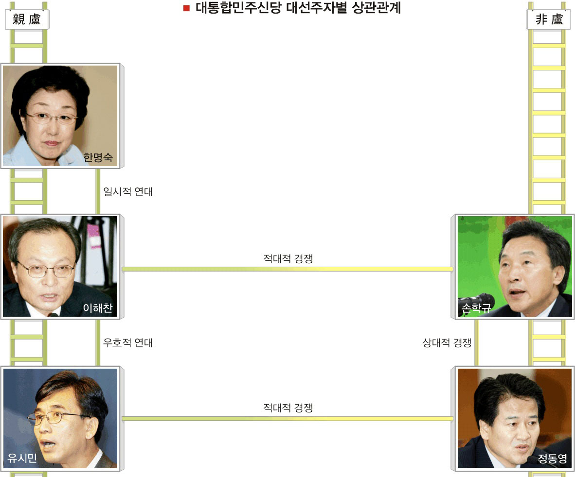 “영원한 적도, 영원한 동지도 없다.” 다음달 3일 시작될 대통합민주신당의 예비경선(컷오프)을 기점으로 후보간 합종연횡이 가시권에 들어왔다. 본 경선에 돌입하면 이합집산이 더 복잡해질 양상이나 확고부동한 ‘연대’나 ‘적대’는 없을 전망이다. 후보들의 생존법에는 시기별·사안별 셈법만이 도사리고 있다.