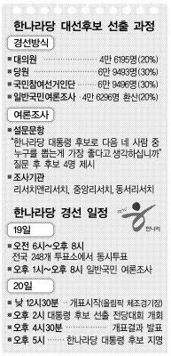 한편 여론조사는 19일 오후 1시∼8시에 진행된다. 여론조사 몫의 표는 4만 6197표다. 투표 당일 당원, 대의원, 일반국민 투표율에 연동돼 반영된다. 예를 들어 투표율이 60%라면 여론조사는 2만 7718표가 지지율에 따라 배분된다.