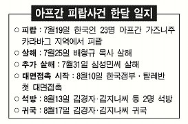 김경자(37)·김지나(32)씨의 귀국 다음날인 18일 아프가니스탄 한국인 인질사태가 한달을 맞았다. 그러나 16일 재개된 탈레반과의 대면접촉이 성과도 없이 끝났고, 차기회담 날짜도 잡지 못해 남은 인질 19명의 석방을 위한 협상이 또 고비를 맞았다.