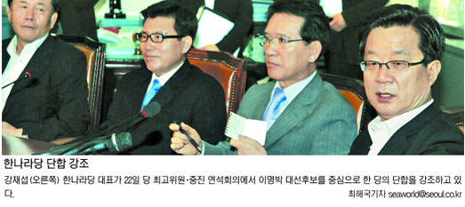 이 후보 선대위원장을 맡을지 여부는 ‘뜨거운 감자’가 분명하지만, 아무도 손을 대려 하지 않고 있다. 선대위가 구성 논의도 시작되지 않아 시간적인 여유가 있다고 판단하는 것도 한 요인이다. 경선 라이벌인 박 전 대표가 이 후보 선대위를 총책임지는 구도가 부자연스럽다는 지적도 많다.
