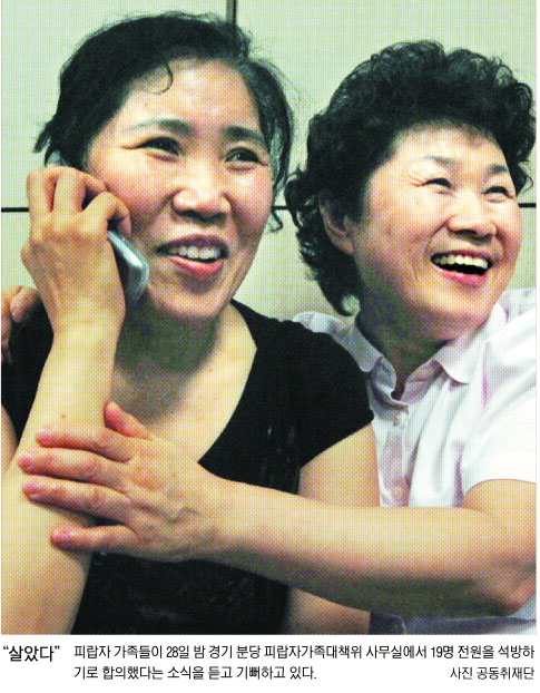 피랍자 전원 석방 소식이 전해지자 분당 피랍자 대책모임 사무실에 모여 있던 피랍자 가족들은 일제히 환호성과 함께 감격의 눈물을 쏟아냈다.