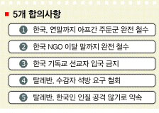 한국 정부와 탈레반은 이날 오후 5시48분부터 7시20분까지 1시간30분 남짓 대면접촉을 가진 뒤 이같이 합의했다.