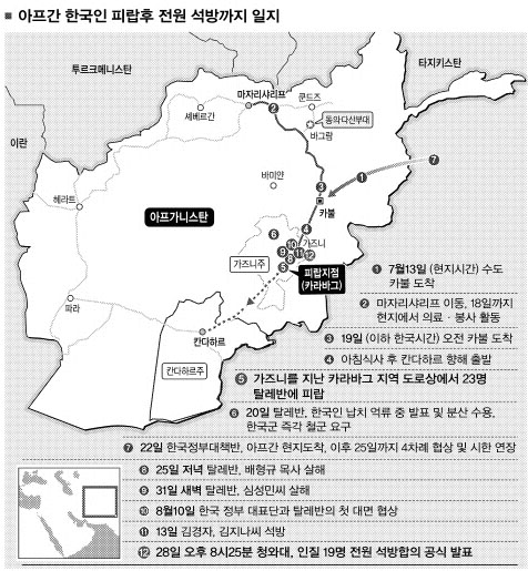 특히 지난 23일 시작된 송민순 외교부 장관의 중동 3개국 순방도 석방 교섭에 영향을 미쳤다는 후문이다. 또 군사작전 불가라는 방침을 고수하며 탈레반을 상대로 대화 작전을 편 것도 협상 성공의 요인으로 꼽힌다.