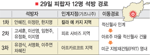 이들은 대신 미리 대기하고 있던 적신월사의 흰색 승합차량에 황급히 올라탔다. 오랜 억류생활 탓인지 자유의 몸이 됐지만 긴장한 모습이 역력했다. 이날 안씨 등을 적신월사측에 인도한 사람은 아프간 부족 원로인 하지 자히르. 그는 지난 13일 김경자·김지나씨가 풀려날 때도 탈레반에게서 김씨 등을 인계받았던 인물이다.