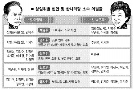 이 가운데 재경위에는 유독 박 전 대표측 의원들이 많이 포진해 있다. 서병수, 엄호성, 유승민, 이혜훈, 최경환 의원 등이다. 재경위 소속 의원들은 이 후보의 BBK 관련 의혹을 앞장서서 제기해 왔다. 이 후보 가족들의 초본 불법발급 의혹이 제기된 행자위나 한반도 대운하 논쟁이 뜨거울 것으로 점쳐지는 건교위, 정무위에도 박측 의원들이 대거 포진해 있다.