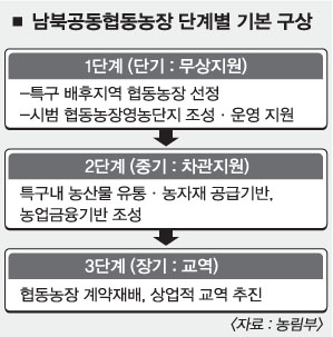 정부는 그동안 남북통일·정상회담 등 비상상황을 대비해 공동협동농장에 대한 청사진을 준비해 왔다. 농림부가 최근 한국농촌경제연구원 용역을 통해 대외비로 작성한 ‘통일대비 농업분야 통합방안’보고서에 따르면 개성공업지구·신의주특별행정구·금강산관광지구 등 경제특구 인접 지역에 공동협동농장 등 영농단지 건설이 추진된다. 이중 개성공업지구에서 8㎞ 떨어진(서울과 1시간 거리) 개풍군 덕수리·화곡리·월정리 일대 500㏊(150만평)가 우선 조성된다. 농림부는 “특구에 유입된 남한의 자본이 특구 배후 협동농장 농산물 소비를 통해 북한내 다른 지역으로 유입되는 ‘연관 효과’를 창출할 수 있다.”고 분석했다.
