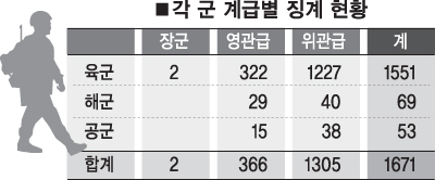17일 국방부가 국회 국방위원회 소속 대통합민주신당의 원혜영 의원에게 제출한 자료에 따르면 2006∼2007년 상반기까지 징계처분을 받은 군 장교는 육군 1551명, 해군 69명, 공군 53명으로 모두 1673명으로 조사됐다.