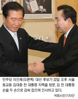 민주당 이인제 대선 후보가 22일 석달 반 만에 다시 동교동을 찾았다. 당시 이 후보는 세 번째 대선 출마 의사를 밝히고 조언을 얻기 위해 김대중 전 대통령을 만났지만 이날은 당 대선 후보 자격이었다.