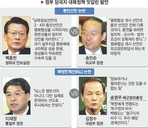 2007 남북정상회담 이후 최대 쟁점으로 떠오른 ‘한반도 평화체제 구축을 위한 종전선언’과 관련, 백종천 청와대 안보실장과 송민순 외교통상부 장관이 24일 공개적으로 다른 입장을 피력하며 정면 충돌했다. 최근 서해 북방한계선(NLL)을 둘러싼 청와대·통일부와 국방부의 이견 노출에 이어 임기 말 청와대와 부처간 엇박자가 극명하게 드러나고 있다는 지적이다.