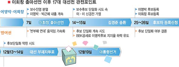 이회창 전 한나라당 총재가 7일 대선 출마를 결국 선언했다. 대선일을 42일 남겨 놓은 시점이다. 이명박, 이 전 총재, 정동영, 문국현, 이인제, 권영길 후보 등 대선전은 유례 없는 다자 구도로 흘러가고 있다. 오는 26일 후보 등록까지는 겨우 17일 남았다. 여·야 정치권은 단일화를 시도하고 있다. 하지만 저마다 완주를 다짐해 쉽지 않아 보인다. 대선에다가 내년 4월 총선까지 맞물리면서 ‘단일화 계산법’은 더 복잡해졌다. 이 전 총재는 칩거 6일만인 이날 오후 2시 자신의 사무실이 있는 서울 남대문로 단암빌딩에 모습을 드러냈다. 그러곤 기자회견을 갖고 “그동안 몸 담았던 한나라당을 떠나 대통령선거에 출마하고자 한다.”고 대선 출마를 선언했다.