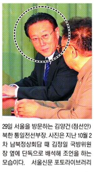 지난 10월 정상회담 이후 이달 들어 총리회담, 남북장관급회담 등 실무회담들이 순조롭게 ‘순항’하고 있는 터여서 굳이 김 부장의 전격적인 등장이 필요한 상황은 아니기 때문이다. 향후 김영남 최고인민회의 상임위원장의 서울 방문 등이 타진되는 것이 아니냐는 전망도 나온다. 김 부장 일행은 육로로 개성과 도라산 CIQ를 거쳐 29일 오전 서울에 도착할 예정이다.
