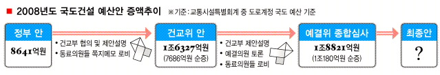 정부가 국회에 제출한 내년도 예산안은 257조원으로 이 가운데 국도 관련 예산안은 8641억원이었다. 국회에서 예결위원들이 증액 요구한 국도건설 예산을 그대로 통과시킬 경우 정부 예산안보다도 두 배 이상이나 늘어나게 된다.