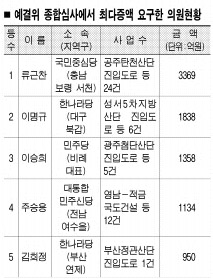 류 의원(충남 보령·서천)은 충남 지역 24개 국도건설 사업 등 3369억원을 증액 요구했다.‘탕정TC산업단지 진입도로’ 사업에 대해 정부는 220억원을 책정했다. 하지만 건교위는 150억원을 추가로 늘렸고, 류 의원은 예결위 심사 과정에서 이보다도 435억원이 많은 585억원을 증액 요구했다.