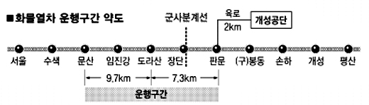 정기 화물열차는 토·일요일을 제외하고 매일 1회 왕복한다. 남북의 물량집하와 열차 조성(컨테이너 구성)은 각각 오봉역과 판문역에서 이뤄지며 운행구간은 도라산∼판문역간 7.3㎞. 매일 오전 9시 도라산역을 출발,9시20분 판문역에 도착하고 북측에서는 오후 2시 판문역을 떠나 2시20분 도라산역에 도달한다.11일 오전 7시 문산역에서 첫 운행하는 열차는 8시20분쯤 군사분계선(MDL)을 관통하게 된다. 열차는 기관차 1량과 컨테이너 화차 10량, 차장차(차장 등 탑승) 등 12량으로 구성된다. 도라산∼판문역간 운행속도는 군사합의에 따라 20∼60㎞로 제한됐다.