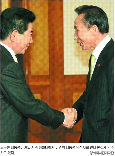 노무현 대통령과 이명박 당선자가 대선 9일 만인 28일 청와대에서 만찬 회동을 갖고 국정 현안을 논의했다.노 대통령과 이 당선자는 이 자리에서 원활한 정부 인수인계와 노 대통령 임기 내 한·미 자유무역협정(FTA) 비준안 처리를 위해 최대한 협력해 나가기로 했다.
